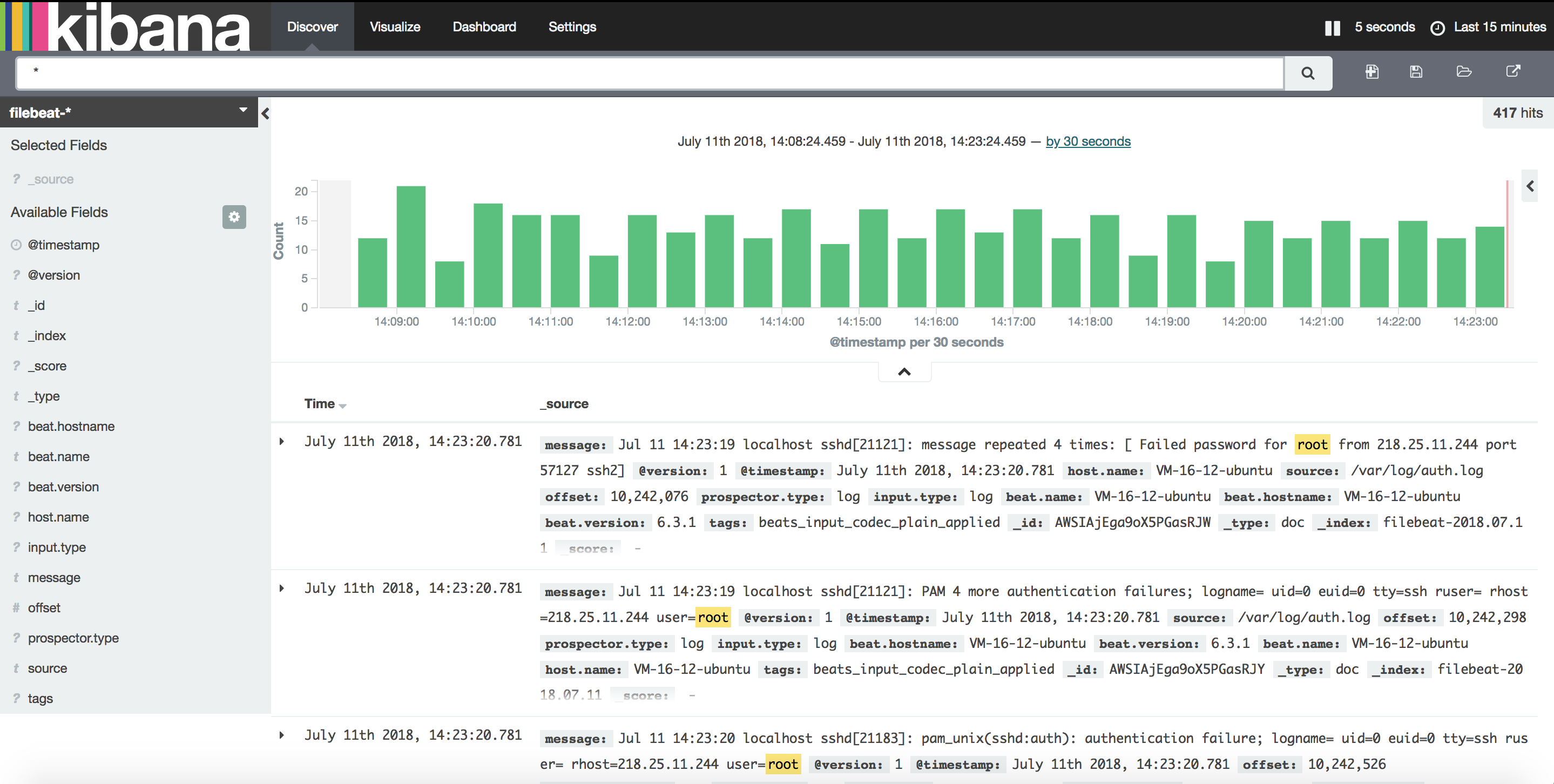 如果您的ELK堆栈设置正确,Filebeat(在您的客户端服务器上)应该将您的日志发送到您的ELK服务器上的Logstash。Logstash应该使用我们之前导入的索引将Filebeat数据加载到Elasticsearch中。