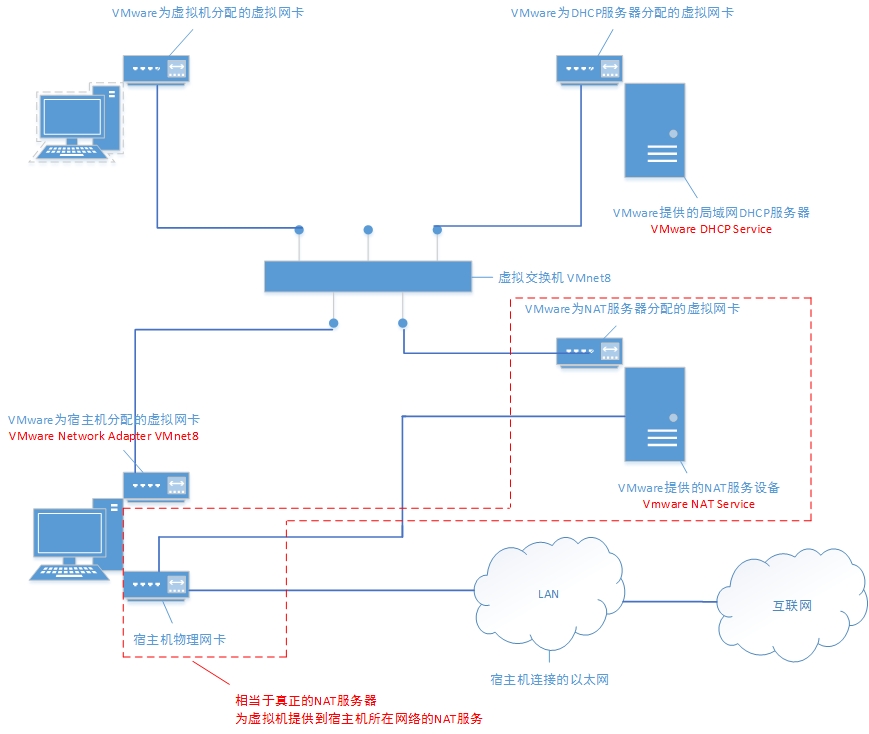 vmware的NAT原理大致如下:虚拟机访问外网通过VMware NAT service这个进程直接跟物理网卡相连,而宿主机访问虚拟机需要通过VMnet8这张虚拟网卡。此外,还有一个VMnet8虚拟交换机,跟VMnet8虚拟网卡不是一个东西。VMnet8虚拟网卡与虚拟机网卡在同一个网段,它们之间通信不需要在网络层进行,只需要在数据链路层。虚拟机和宿主机都是这个网段的一台主机。