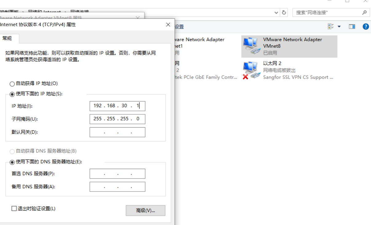 service network restartping baidu.com此时能上外网了,但是想要和宿主机互相访问还需要看一下网卡的设置。打开windows的网络中心,选择VMnet8这张虚拟网卡,查看其ipv4设置,ip地址需要跟NAT子网一个网段,最后的主机号不能跟虚拟机的主机号相同。