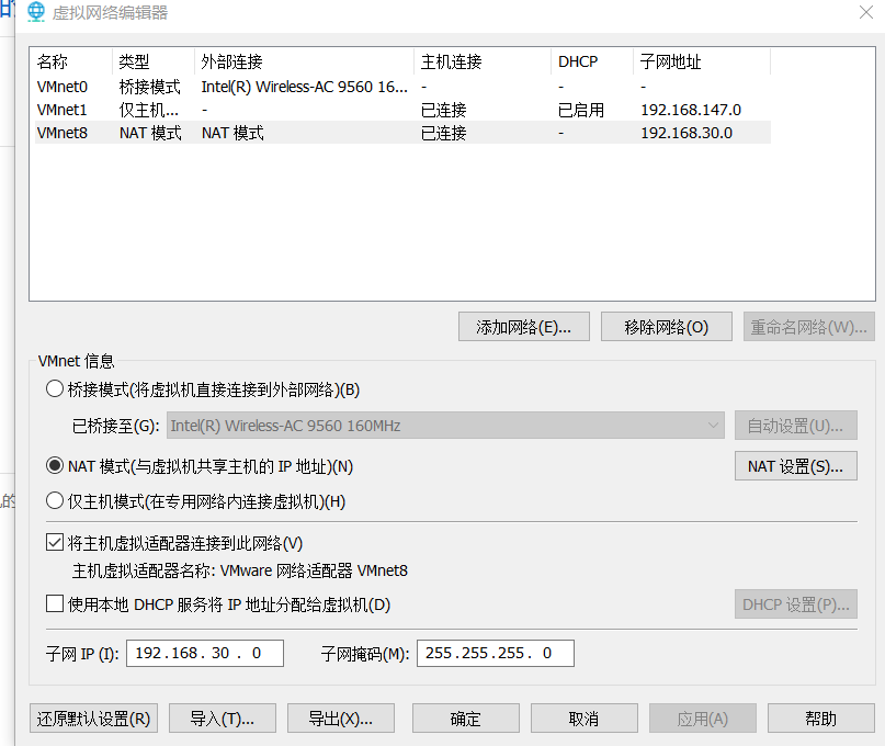 vmware选择编辑 -> 虚拟网络编辑器 -> NAT模式